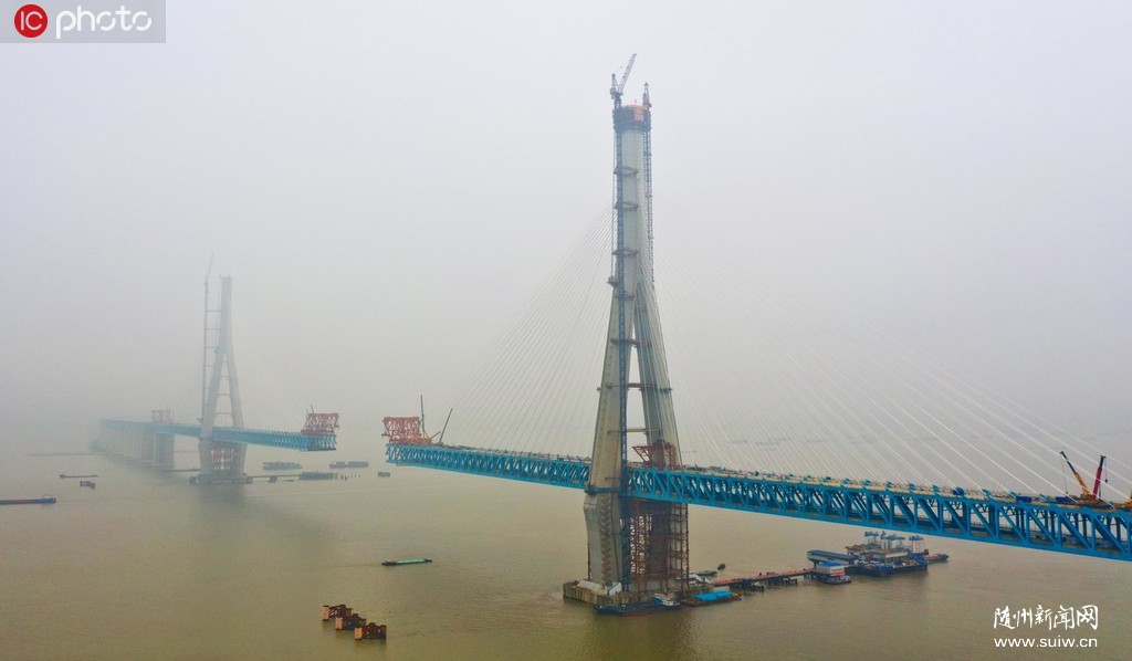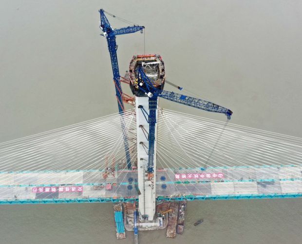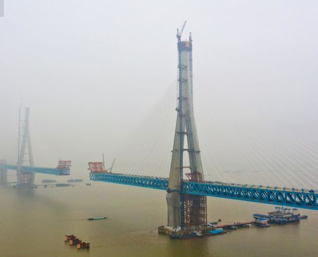 6月27日沪通长江大桥南主塔顺利封顶。至此,该桥两座高达330米的主塔全部建成,标志着世界最大跨度公铁两用斜拉桥建设取得了关键性进展。沪通长江大桥全长11072米,主桥长2296米,主跨1092米,是沪通铁路全线的控制性工程,设计为上层6车道高速公路,下层4线铁路。丁晓春/摄