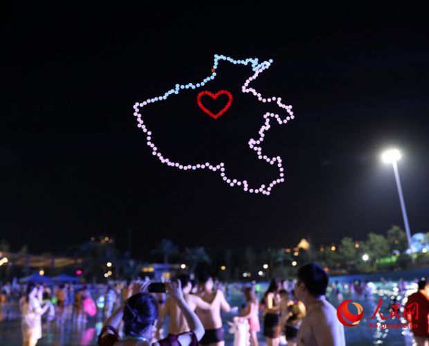 人民网郑州7月14日电(霍亚平)河南地图、少林功夫、司母戊鼎、甲骨文、卢舍那大佛、鲸鱼、金字塔、雪花……7月13日晚,200架无人机编队在夜空中变幻出各种奇幻造型,亮相郑州银基国际旅游度假区,为游客带来了一场精彩绝伦的视觉盛宴。