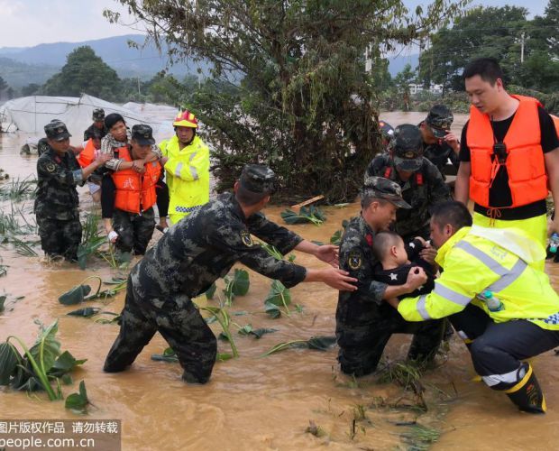 2019年7月13至14日,受强降雨影响,江西赣州瑞金、于都、会昌等地突发严重洪水内涝,导致约3100余名群众受困。武警江西总队赣州支队迅速出动112名兵力,分赴瑞金万田乡、九堡镇、于都沙心乡、会昌西江镇等地转移受困群众。目前,官兵仍奋战在救援一线。江武/摄