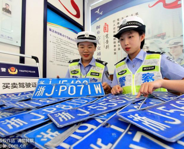 2019年8月14日,浙江省台州市路桥区路北街道交警正在整理从积水路段中捡回的车牌。超强台风“利奇马”过后,台州市路桥区交警在路面捡到车牌200多张。目前,交警正逐一电话联系车主前来领回。蒋友亲