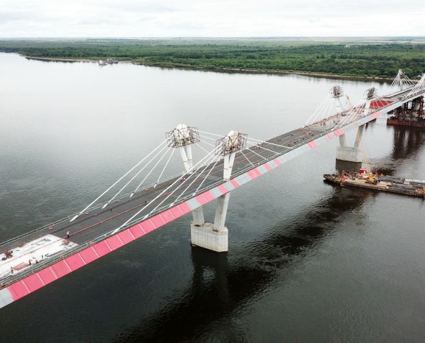 目前,中俄合建的首座跨境公路大桥——黑河到布拉戈维申斯克黑龙江(阿穆尔河)大桥进入桥面铺装施工作业阶段。大桥于今年5月31日顺利合龙,目前中方每天有约200名工人进行混凝土浇铸桥面作业,预计桥面施工将持续到9月上旬。大桥全长1284米,建成后将形成一条新的国际公路通道,实现中俄地方城市之间互联互通。新华社记者 王建威 摄