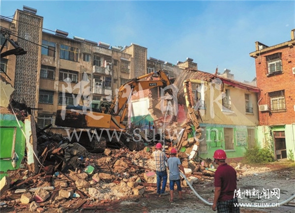 随州日报讯 8月20日,有着50多年历史的铁树南生活区开始拆除。据悉,该小区是随州中心城区最大的棚户区,为了加快片区改造,改善民生,改善城市形象,市政府将拿出4.7亿元补偿资金对其进行整体拆除。大图为铁树南生活区俯瞰图。小图为正在拆除的原铁树幼儿园。(随州日报全媒记者 李文军摄)