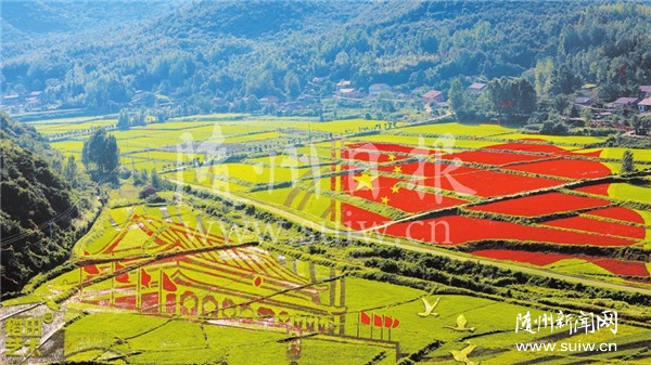 随州大洪山风景名胜区的“稻田艺术”近日呈现出绚丽的彩色图案,这是该景区为庆祝新中国成立70周年,以“我和我的祖国”为主题,种植的黑、红、黄、白、青五种颜色的秧苗,艺术化勾勒出天安门、五星红旗等图案。目前,“稻田艺术”已进入最佳观赏期。(随州日报通讯员杨峰摄)