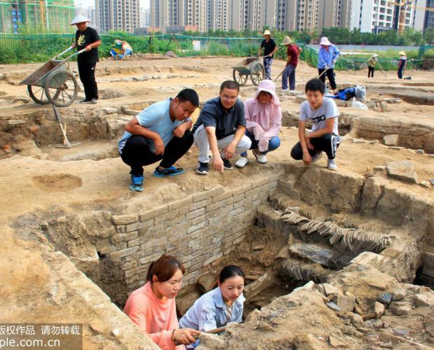 2019年9月3日,安徽省淮北市濉溪县濉溪镇沱河路北侧明清时期酿酒作坊遗址考古发掘现场一片繁忙景象。2018年9月底,当地棚户区改造工程施工时,意外发现疑似酿酒发酵池遗迹。今年3月,安徽省文物考古研究所启动该遗址考古发掘工作,通过几个月的清理发掘,共发现3个蒸馏灶,1个冷却池,1处曲房,32个发酵池,16处房址,8条排水沟,共出土酒坛、酒杯、酒瓶等遗物600多件。考古专家通过对发掘区域与历史地图位置比对,判定发掘的是明代晚期、清代至民国时期的三个糟坊:祥源、大同聚和魁源。