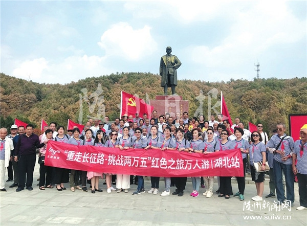 随州日报讯 9月22日,华运高铁旅游集散中心联合湖北幸运乐游共同举办“重走长征路,挑战两万五”红色寻根之旅,约万余名游客赴随州、广安、保定等多地开展红色寻根,庆祝新中国成立70周年。图为数百名游客齐聚九口堰,追忆革命历史,传承红色精神。(随州日报全媒记者冯家园、通讯员汪雷摄)