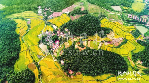 随州日报讯 金秋时节,一块块水稻梯田泛着金色波浪,到处是一幅幅美丽的丰收画卷。图为随县洪山镇稻田俯瞰图。(随州日报全媒记者 李文军摄)