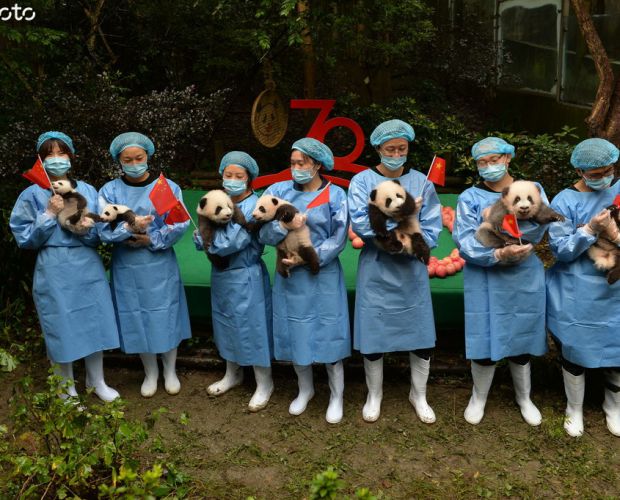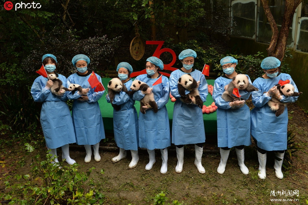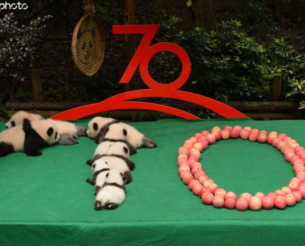 2019年9月24日,四川成都大熊猫繁育研究基地,7只新生大熊猫拼出“70”图案,庆祝中华人民共和国成立70周年。