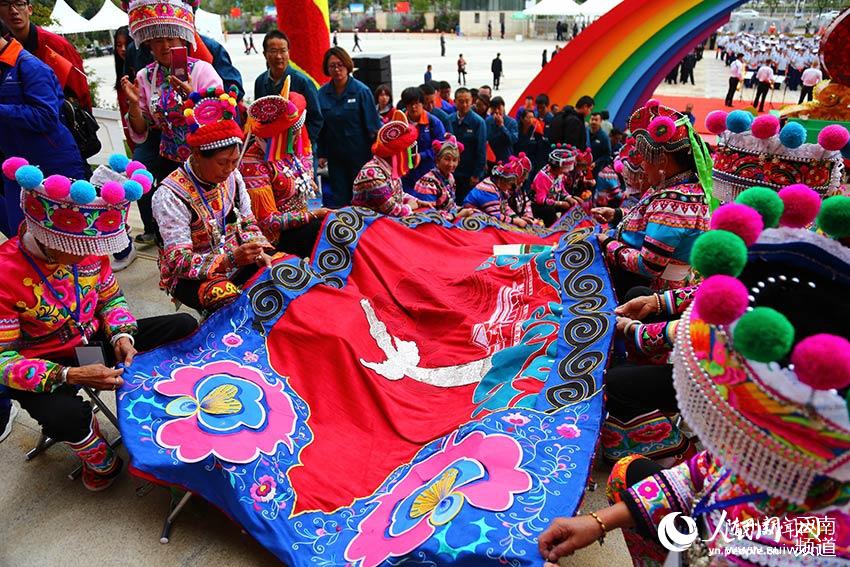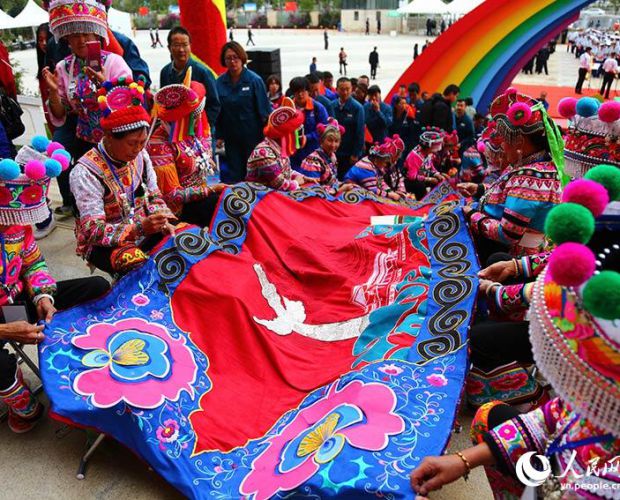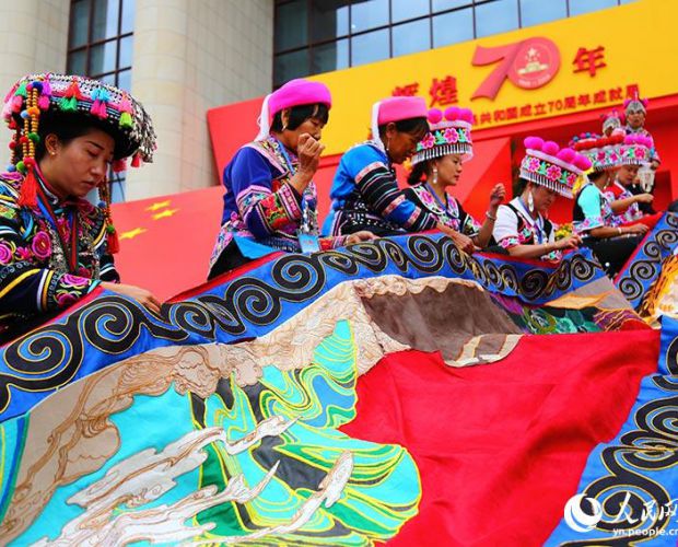 人民网昆明9月25日电 (李发兴)9月25日,云南省庆祝中华人民共和国成立70周年成就展在云南文学艺术馆开展,来自云南楚雄彝族自治州的70名彝族绣娘,现场手绣彝族刺绣长卷“神州锦绣”,庆祝新中国成立70周年。