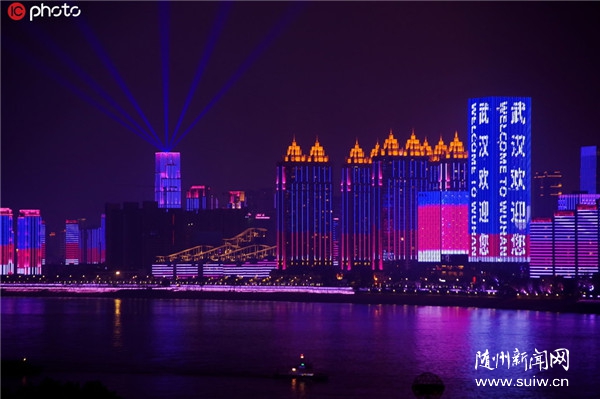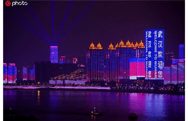 2019年10月17日,武汉,第七届世界军人运动会即将在武汉举行,以迎接军运会为主题的灯光秀在武汉精彩上演,两江四岸建筑物披上五彩霓裳,吉祥物“兵兵”的形象在楼宇间穿梭,“武汉欢迎您”5个大字占满整栋高楼,美丽江城,流光溢彩迎军运。(IC photo)