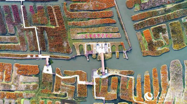 人民网泰州10月28日电 (记者王新年、朱殿平)秋意渐浓,在江苏省兴化市千垛景区,万寿菊、百日菊、波斯菊等万亩菊花竞相开放,空中俯瞰宛如天然调色板。当地将传统的耕种方式与垛田地区万垛耸立、千河纵横的独特地貌相结合,突出“种风景、卖风景、富农民”,造就了“春看菜花、夏观荷花、秋赏菊花、冬品芦花”的四季美景。