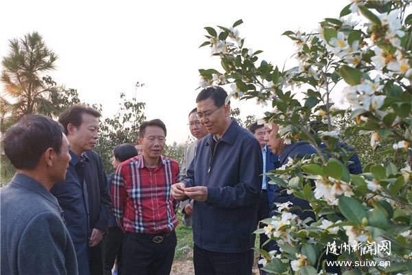 今年9月17日,习近平总书记在河南省信阳市光山县调研油茶产业时指出,“要坚持走绿色发展的路子,推广新技术,发展深加工,把油茶业做优做大,努力实现经济发展、农民增收、生态良好。”随州山区林地面积大,气候适宜木本油料生长,同时,木本油料也是很好的生态树种,集生态、经济、社会效益于一身,一年栽种、百年受益。位于环潭镇刘庙村的随州市慧勤生态农业有限公司万亩油茶基地,1500余亩油茶已经进入初产期,一座座山头上,白色的油茶花正在盛开,嫩绿的油茶果挂满了枝头,长势喜人。陈瑞峰走进油茶林,仔细查看油茶结果情况,详细询问基地建设、经营运转和油茶产业带贫情况。据介绍,明年部分油茶树将进入丰产期,亩产值达4000元,届时可以带动周边两百余户农民增收。陈瑞峰强调,油茶产业在我市实施乡村振兴战略、巩固脱贫攻坚成果中拥有巨大的生态优势和潜力。要认真学习贯彻习近平总书记重要讲话精神,坚持走以“生态优先、绿色发展”为导向的高质量发展新路子,因地制宜大力培育油茶产业,推广新技术,发展深加工,努力把油茶产业做成农民增收、企业增效的绿色产业。