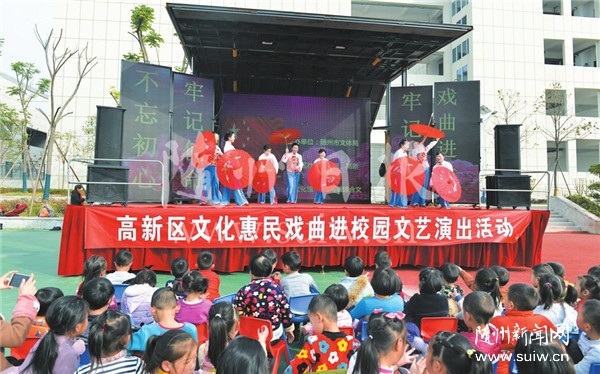 随州日报讯  随州市文化惠民送戏曲进校园活动日前在随州高新区淅河镇拉开帷幕,文艺工作者为师生们表演了非遗传承节目,为学生和观众普及戏曲知识。(随州日报全媒记者孙洪涛、通讯员王涛摄)