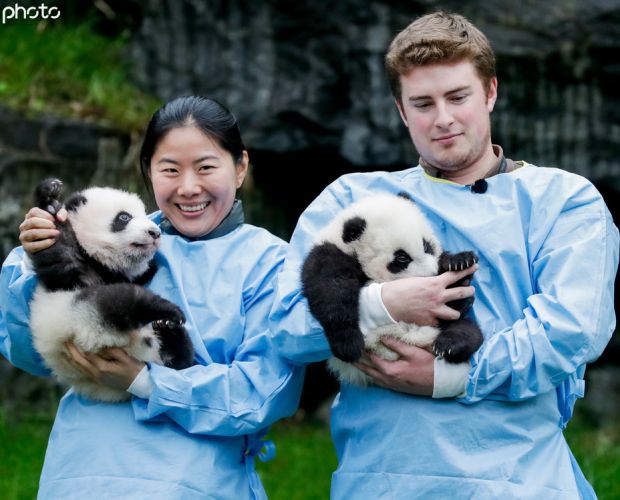比利时新生双胞胎大熊猫宝宝亮相 对着镜头打招呼又乖又萌