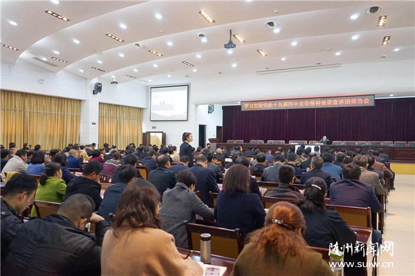 随州日报讯(全媒记者张琴)11月22日,学习贯彻党的十九届四中全会精神省委宣讲团报告会在市委会议中心举行。省委宣讲团成员、省政府研究室主任覃道明作题为《“中国之治”的政治宣言和行动纲领》报告。