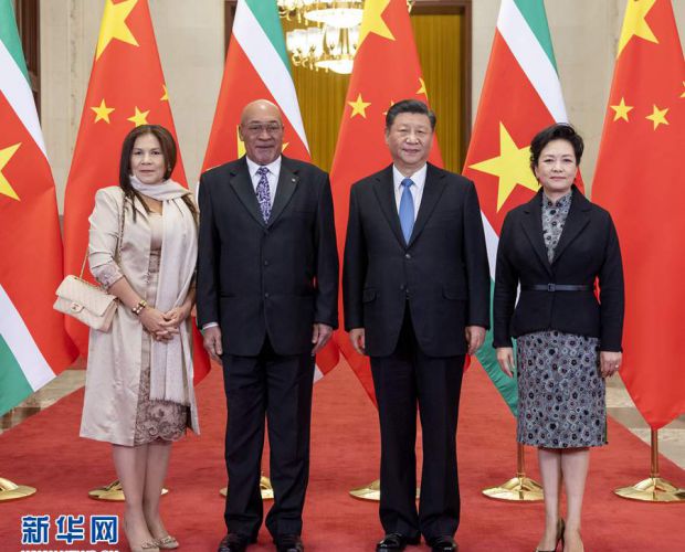 11月27日,国家主席习近平在北京人民大会堂同苏里南总统鲍特瑟会谈。这是习近平和夫人彭丽媛同鲍特瑟总统夫妇合影。 新华社记者 李学仁 摄