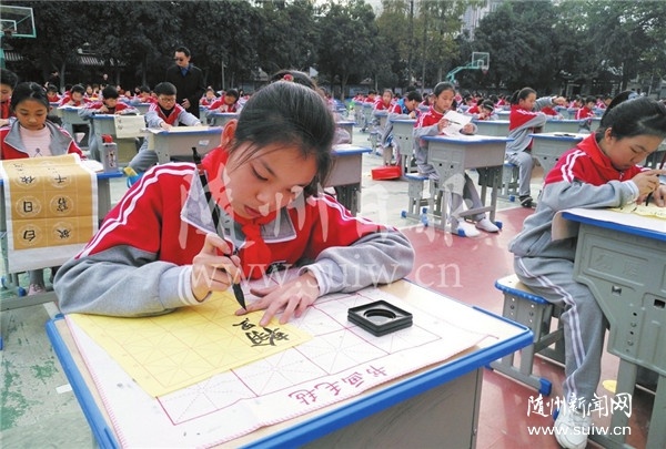 随州日报讯 我市书法进校园活动日前在曾都区实验小学启动。开展书法进校园活动,旨在让中小学生对中国传统文化有更加深刻的认识和理解。(随州日报全媒记者 孙洪涛摄)