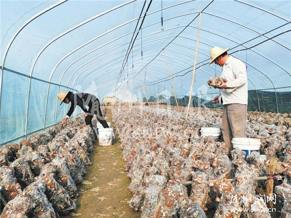 随州日报讯 曾都区洛阳镇邱畈村集中有限的扶贫资金走产业扶贫之路,全村发展香菇大棚100个,种植规模达50万棒,年产值300余万元,为贫困户创收80万元。图为工人在邱畈村扶贫共创基地采摘地栽香菇。(随州日报全媒记者 李文军摄)