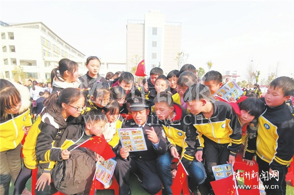 12月12日,“礼赞新建线,唱响护路歌”全省铁路安全暨大型路外宣传活动启动仪式在随州高新区淅河镇云龙学校举行。该活动由省委政法委(省护路办)主办,随州市政法委(市护路办)、随州高新区管委会承办。图为随州铁路民警现场为孩子们讲解铁路安全和护路知识。(随州日报全媒记者 李文军摄)