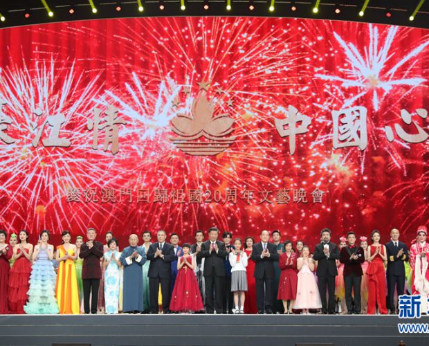12月19日,庆祝澳门回归祖国20周年文艺晚会在澳门东亚运动会体育馆举行。中共中央总书记、国家主席、中央军委主席习近平观看演出。晚会最后,习近平走上舞台同全场观众一起高唱《歌唱祖国》。 新华社记者 黄敬文 摄