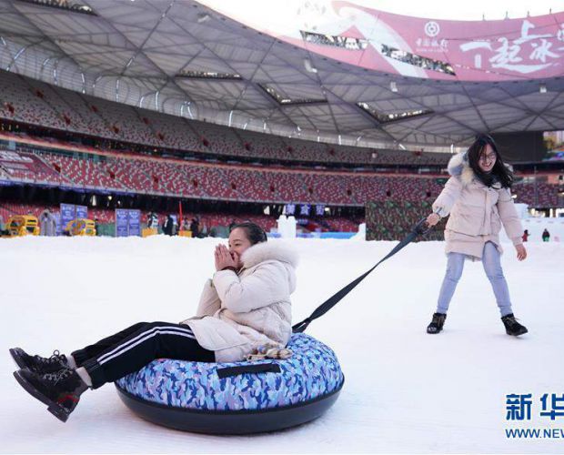 12月26日,游客在北京奥林匹克中心区体验滑冰乐趣。 当日,第二届“相约2022”冰雪文化节在北京奥林匹克中心区开幕,活动将持续到2020年2月8日。据悉,本届冰雪文化节秉持“让奥林匹克点亮青年梦想,让冬季运动融入亿万民众,让奥运盛会惠及发展进步,让世界更加相知相融”的愿景,联动双奥场馆“鸟巢”“水立方”及庆典广场,通过文化推广、科技展示、冰雪体验、公益活动等方式,将中国文化、冬季体育和奥林匹克精神有机结合,打造独具冬奥特色、全民参与的冰雪主题文化活动平台,为2022年北京冬奥会预热。 新华社记者 鞠焕宗 摄