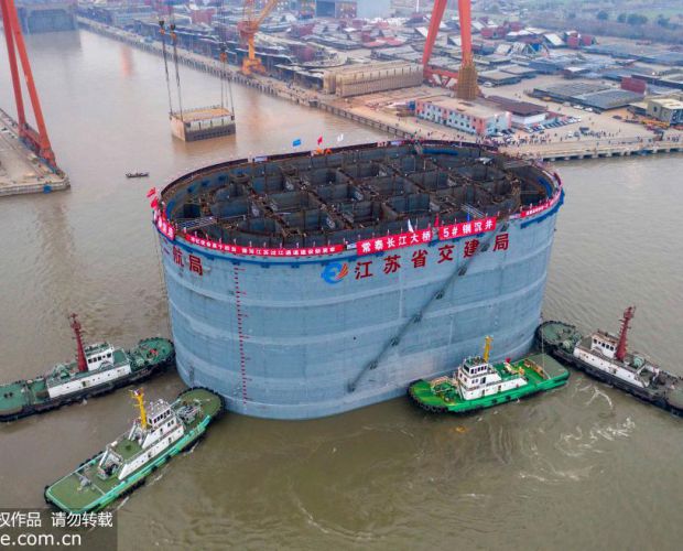 2019年12月28日,世界最大钢沉井——常泰长江大桥第5号墩钢沉井出坞,将沿长江浮运到达预定位置,并进行下沉施工。主跨1176米的常泰长江大桥是世界上首座突破千米级的公铁两用斜拉桥,其两个主塔墩(5号、6号)沉井基础体积大,平面尺寸相当于13个篮球场大小,高度达72米,是目前世界上最大的水中沉井。