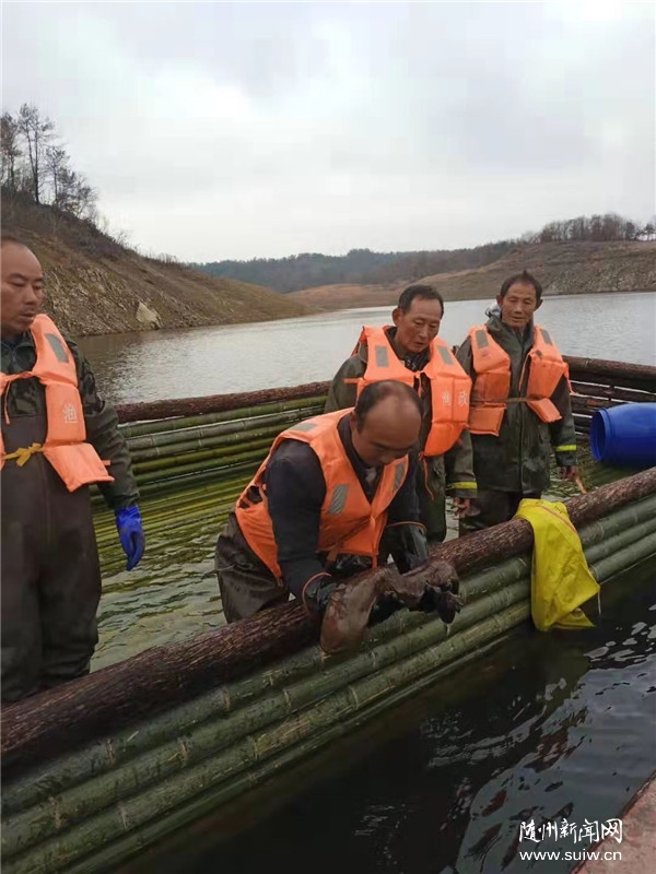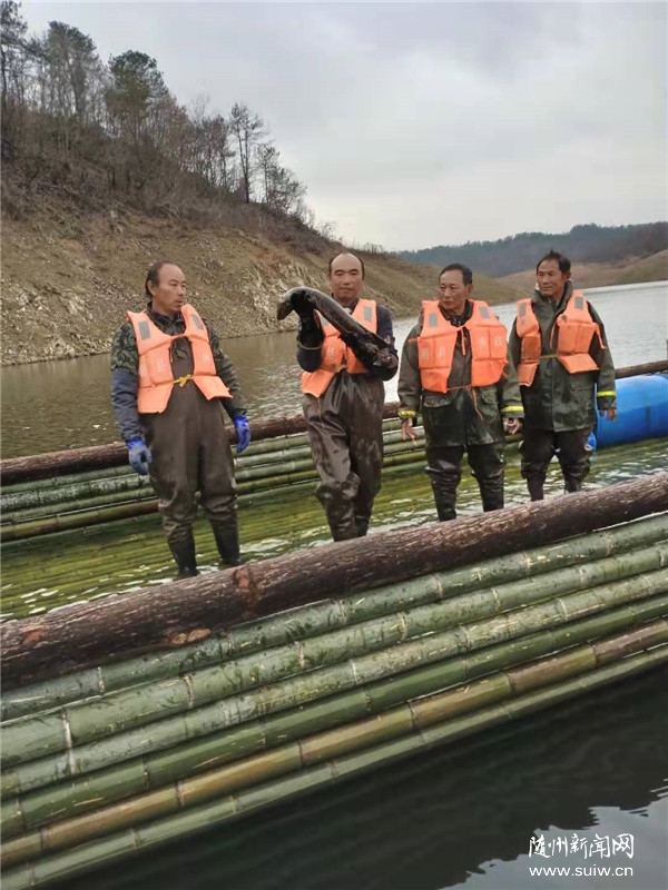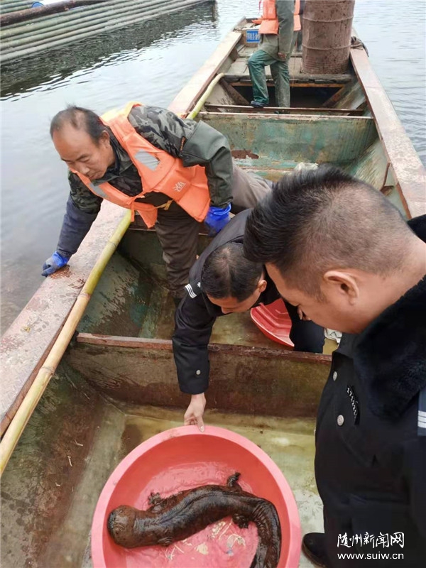 随州新闻网讯 随县均川罗河水库的员工日前在捕捞作业中捞起一条重约12斤的娃娃鱼。水库管理人员及时上报,在随县渔政执法人员的帮助下,将这条娃娃鱼放生。(通讯员 张海勤 摄)