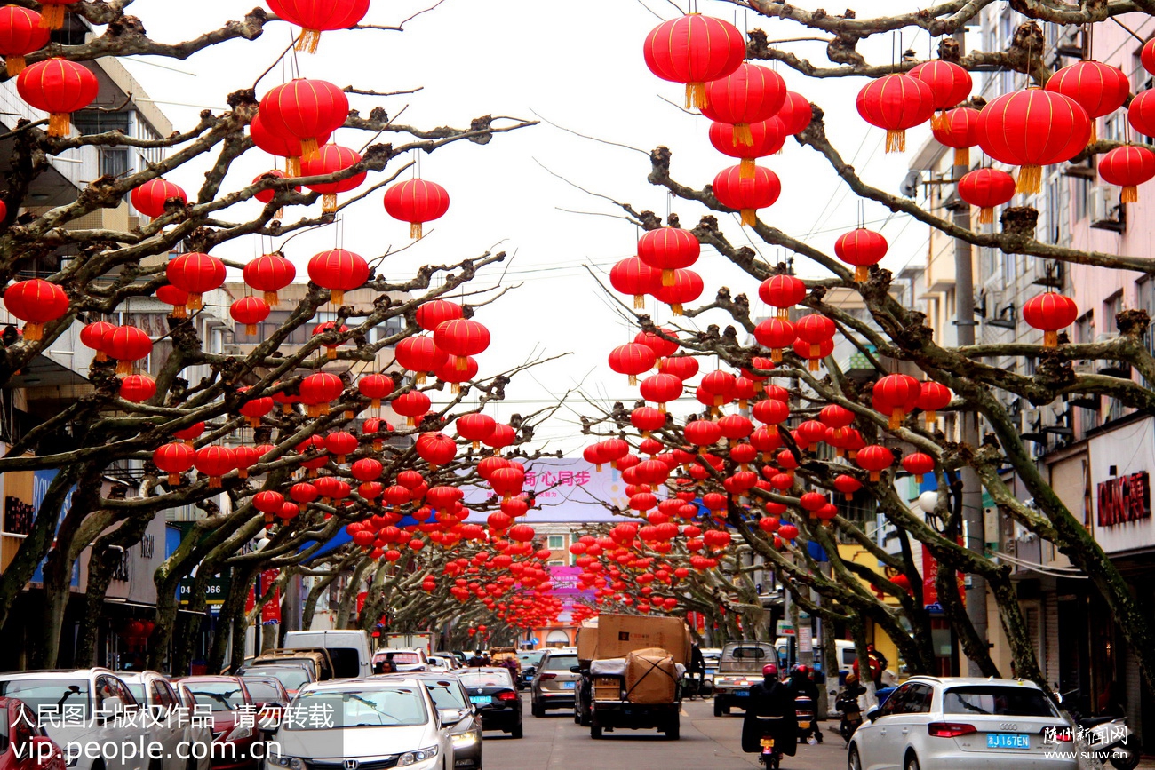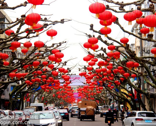2020年1月18日,浙江省台州市路桥区金清镇人民路,道路两旁的行道树上挂满大红灯笼,一片喜气洋洋的年味景象。蒋友青