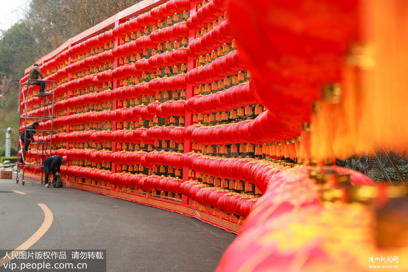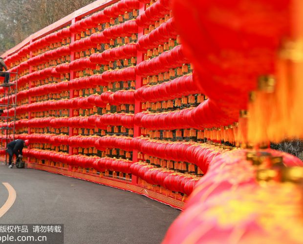 2020年1月18日,工人在湖北省宜昌市秭归县屈原故里文化旅游区张挂灯笼、安装彩灯。王罡