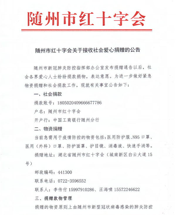 【权威发布】随州市红十字会关于接收社会爱心捐赠的公告