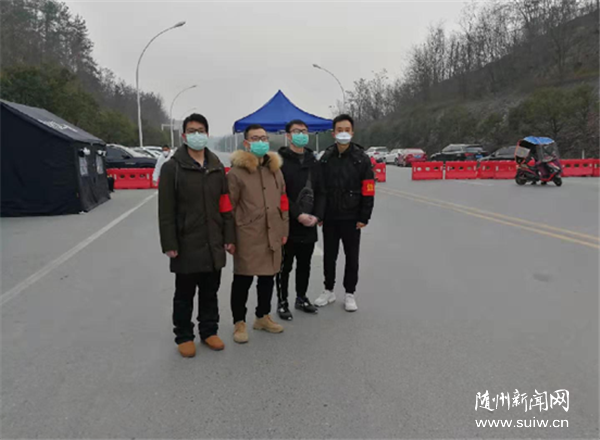 市市场监管局疫情防控维稳突击队队员陈功、闻浩、任学兢、李晓乐在市委党校路口执勤,协助交警和医务人员做好过往车辆行人通行证查验、体温检测和登记等工作。
