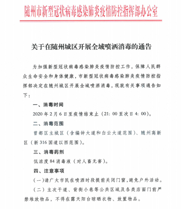 【权威发布】关于在随州城区开展全域喷洒消毒的通告