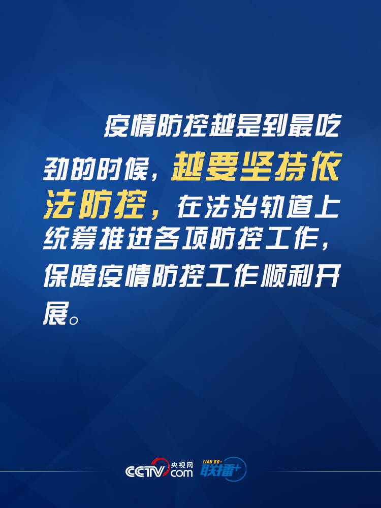 习近平在中央全面依法治国委员会第三次会议上强调,从立法、执法、司法、守法各环节发力,全面提高依法防控、依法治理能力,为疫情防控工作提供有力法治保障,并提出九个“要”: