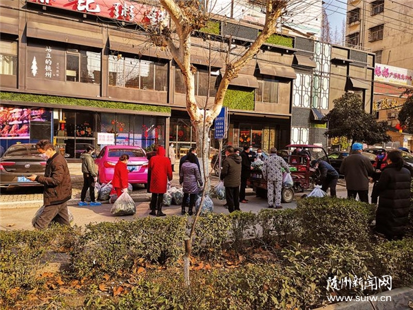 随州日报讯 谨防“好事”变“坏事”。人员不聚集、不扎堆是防控新冠肺炎的基本要求,而随城有些市民在网上平台订购蔬菜到达后,众多人员争相取菜。图为2月9日下午烈山大道楚风社区路段订户取菜现场。 (随州日报全媒记者罗毅摄)