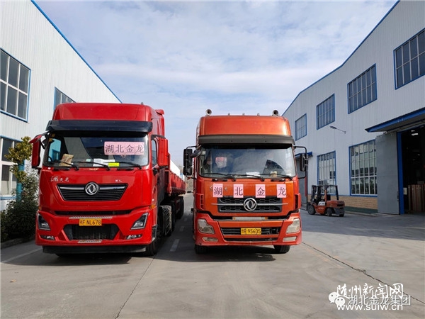 10日上午,金龙集团立即按防控规定要求,向市防控指挥部请示后,迅速安排工作人员组织货物,办理出库和通行手续,协调装运人员和车辆,现场忙忙碌碌但紧张有序。上午11点,两辆满载医用地板的车辆终于按时出发,发往襄阳抗击疫情第一线。