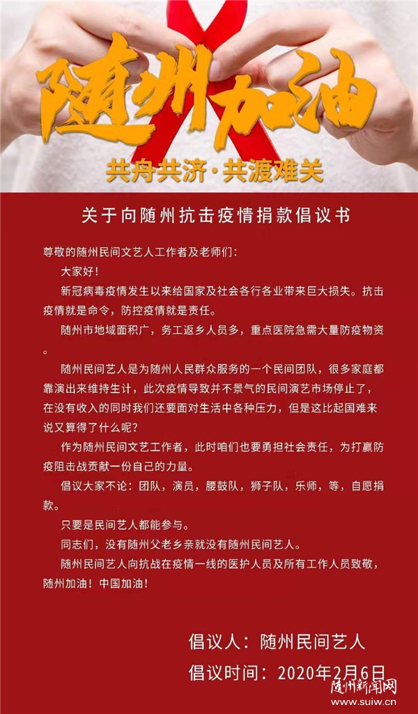 2月6日,相关组织者向全市民间艺人发出了《关于向随州抗击疫情捐款的倡议书》,三天时间得到294位全市民间艺人的响应,自发捐款57000元。收到捐款后,他们及时向随州市疫情防控指挥部报告捐款情况及采购计划,随后由曾都区防疫指挥部安排专车并带上专业的医护人员一同到仙桃专业生产医护物资的厂家采购。目前已向市中心医院捐赠158套防护服,曾都医院600套防护服和一箱粘胶、随县人民医院5000只口罩已全部送到。。