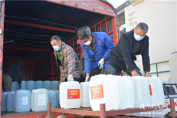 物资运到后,其中3吨消毒液定向捐赠给澴潭镇,其余7吨由随县防控指挥部接收并分配。代表澴潭镇前来接受捐赠的郑勇说:“镇上每天都用消毒液喷洒消毒,这批捐赠真是及时雨。”