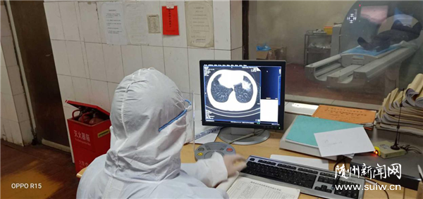 CT室主任高雄已经50多岁,因为每天要看成千上万张CT图像,早已带上了老花镜;老专家韩铁烈,平时就有高血压,马上就要退休了,可他俩依然不辞辛劳,坚持上着夜班;还有张义兵、余津津、余璨、刘弈杉、李晓明等医护人员,他们每天身着完全密封的防护服,厚重的护目镜,紧的能把鼻梁勒出血的N95口罩,不停的在机房和操作台前来回穿梭工作。在紧张的环境里,为了让病人能早点做检查并尽快得到准确的CT报告,为了节省时间,也为了节约身上穿戴的防护设备,科室工作人员都是六个小时以上不喝水不吃饭,不上厕所,时刻绷紧着弦,没有丝毫的放松。