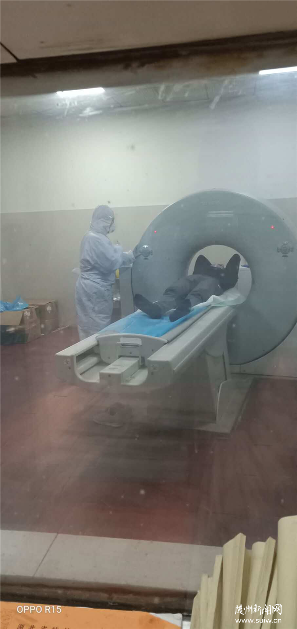 “请您在走廊稍等一会,CT结果半小时就出来了”,这是在随州市中医院CT室的门口,医生正在耐心的告知刚做完CT的疑似新冠肺炎的患者。在医生,技师,护士的通力合作下,发热患者的CT检查紧张而有序的进行着。