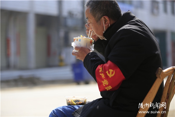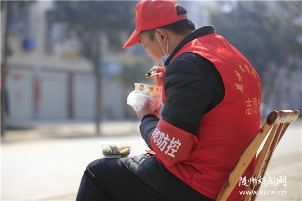 随州日报讯 为巩固疫情防控成果,高城镇75名党员、干部和志愿者分布在镇区28个街道路段,4个执勤卡点,钉守在防控一线,饭菜均由镇政府统筹安排送到每一个执勤点,确保饭送到岗、岗不离人。(通讯员 沈博、张玉国摄)