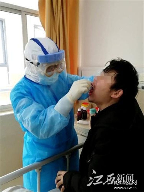 江西医疗队队员叶仁江在采集患者咽拭子。