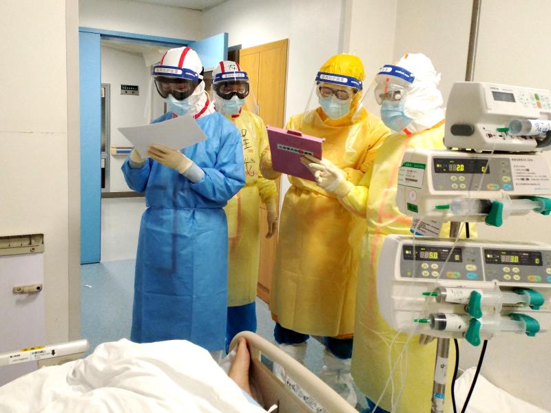 2月11日,在武汉同济医院中法新城院区ICU病房内,来自北京协和医院的医护人员在病床旁查房交班。