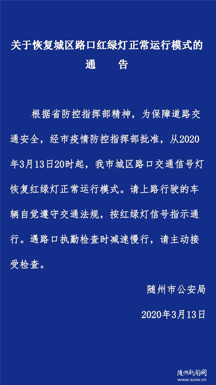 【重要通告】关于恢复随州城区路口红绿灯正常运行模式的通告