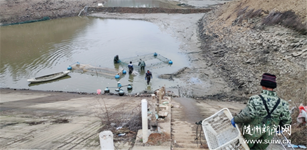 柏树湾村水产基地。负责人邓后付和张光勇,正在指导工人抢抓春季干库黄金期培育鱼苗。目前,600多亩的水产面积已经完成育苗工作,还有几百亩的水面正在进行中。