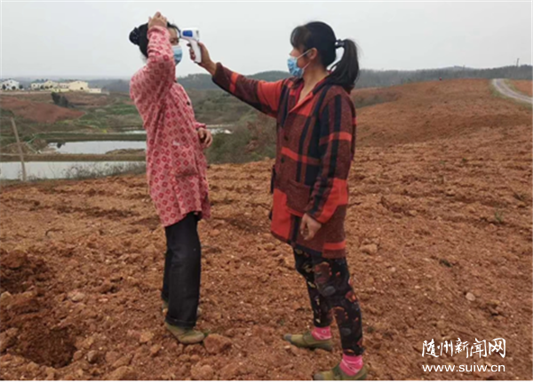 “来,先测个体温。”体温监测专班成员张梦对李中芹说道。村党支部书记张桄沦任体温监测专班组长,要求全村有序开展春耕生产时,每天对下田劳动的村民进行行体温检测和消毒,并监督他们保持至少1.5米以上的安全距离,劳作错时错峰、分片分区。
