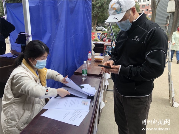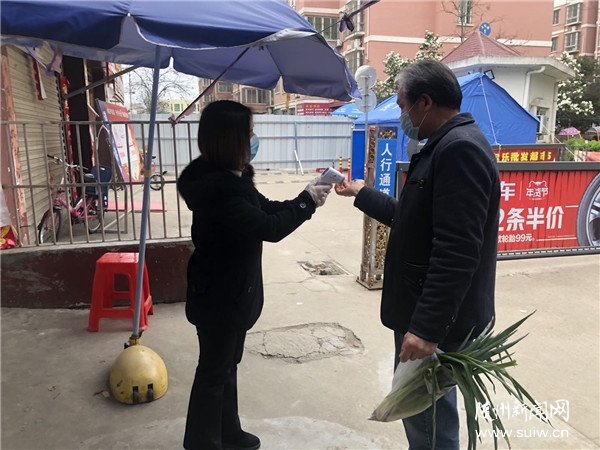 随州日报讯(见习记者 王聪莹)“你好,请出示一下您的健康码,并量一下体温。”3月16日下午,记者在文峰都市花园北门卡口看见,工作人员正在对进出的居民进行检测。