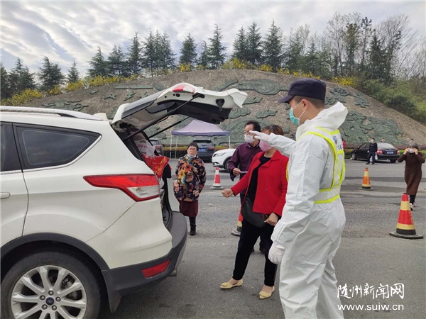 8:35,一辆广东牌照的私家车驶来,曾都公安分局巡警大队队长胡志军抬手示意停车。“您好,请出示电子通行证。”车主周先生拿出手机,胡志军仔细查验电子通行证上显示的出发地、目的地、车内人员数等信息,并打开车辆后备箱查验。初审通过后,车内四人下车前往前方曾都区交通局路政人员临时设置的办公点,出示健康码、身份证等,填写离随人员承诺书,路政执法人员登记离随车辆人员检验信息等。何店镇中心卫生院人员现场再次测量体温。三道查验办妥后,车主周先生一家驶上汉十高速。