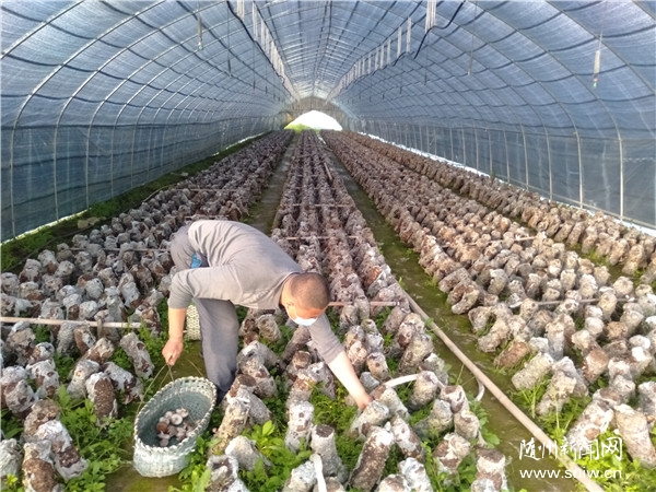 除了制棒,香菇采摘也正在抢时。疫情带来的教训,邱畈村不敢忘。虽要抢抓这最后一个月的出菇时间,邱畈村仍严格实行单人单棚,即一个香菇大棚一次只能进一人。驻村第一书记邓大勇介绍,首先必须是健康码为绿码的村民才能进棚劳作,且进出棚必须戴口罩、测量体温。