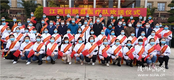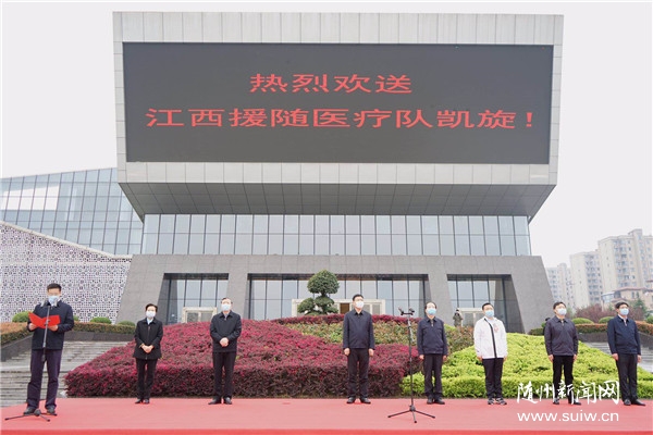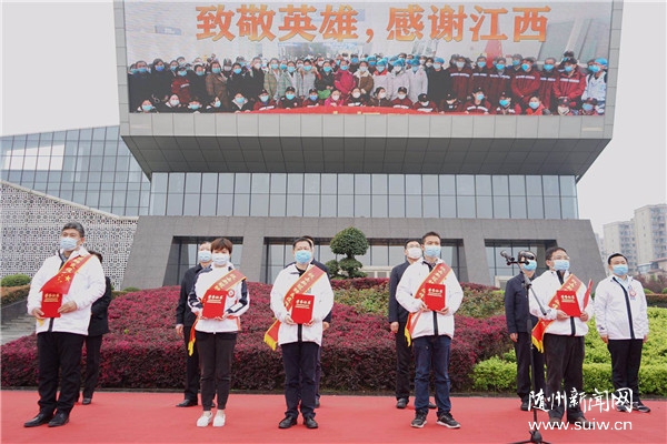 省人大常委会副主任刘晓鸣出席活动并为江西援随医疗队颁发“抗击新冠肺炎疫情先进集体”荣誉牌匾。江西省援随前方指挥部指挥长、江西省委统战部常务副部长陈敏,市委书记陈瑞峰分别讲话。市委副书记、市长克克主持仪式。市人大常委会主任夏卫东,市政协主席冯茂东,市委常委、常务副市长林常伦,副市长郑晓峰等参加活动。与会省市领导为江西医疗队代表颁发“抗击新冠肺炎疫情先进个人”荣誉证书。