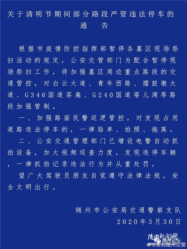 根据市疫情防控指挥部暂停各墓区现场祭扫活动的规定,公安交管部门为配合暂停现场祭扫工作,将加强墓区周边重点路段的交通管控,对白云大道、青年西路、擂鼓墩大道、G346国道茶庵、G240国道塔儿湾等路段加强管制。