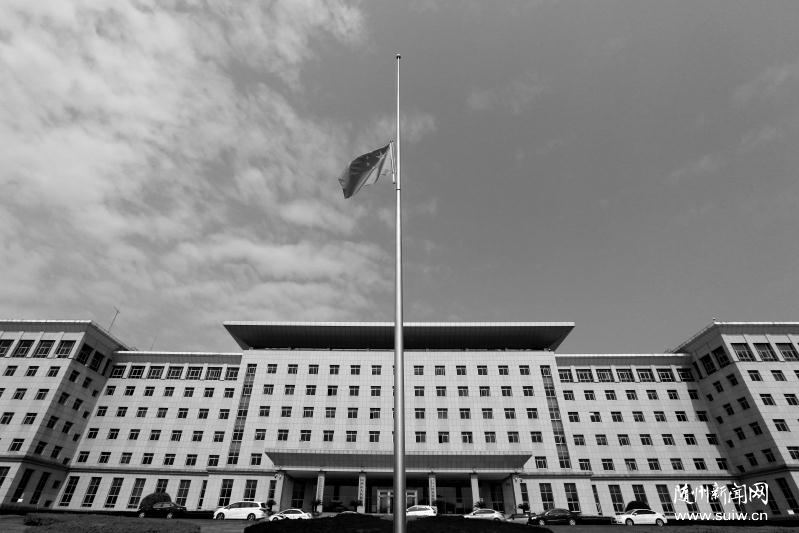 4月4日上午,随州市政府楼前广场降半旗志哀,以最庄严的方式深情哀悼在此次新冠肺炎疫情中牺牲的烈士和逝世的同胞。(随州日报通讯员杨峰摄影报道)